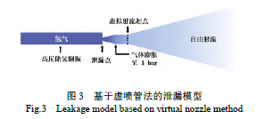 根據(jù)氣體泄漏源的壓力與環(huán)境壓力的比值,泄漏產(chǎn)生的氣流可分為不同的類型,而高壓儲罐/管道泄漏一般會形成高壓欠膨脹射流。Xiao等人假定存在一個氣流絕熱膨脹至大氣壓的過程(如圖3所示),在自由射流模型中引入虛擬出口,探究泄漏源附近的濃度場和速度場變化情況。Zhang 等人基于等熵膨脹過程和真實氣體狀態(tài)方程計算了出口處射流的特性參數(shù)。Zou考慮了高壓氫氣泄漏過程中的熱交換現(xiàn)象,使用范德華方程和焓方程建立HEC(熱交換)模型,并將此模型與基于等熵過程假設(shè)的模型進行比較。但現(xiàn)有的理論模型都僅對開敞空間有一定的適用性,而對受限空間以及有障礙物的情況則很難給出合理的測。