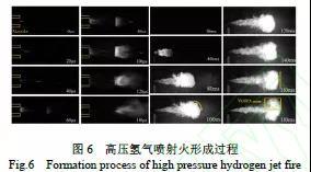 若高壓氫氣泄漏后被點燃(外部點火源或發(fā)生氫氣自燃)則很可能引發(fā)噴射火。近期,Jiang 等人利用高速照相機記錄下了管道出口處自燃火焰轉(zhuǎn)化成噴射火的全過程(如圖6),在火焰?zhèn)鞑サ某跗?,距離噴嘴一定距離處會形成馬赫盤,其背面出現(xiàn)扁平火焰,隨后噴嘴處的火焰逐漸消失,而由馬赫盤下游的火焰繼續(xù)傳播并最終形成噴射火。除了火焰?zhèn)鞑ゼ捌滢D(zhuǎn)變過程外,噴射火特性參數(shù)的影響因素也是重點研究方向。閆偉陽等人探究了不同管長和泄放壓力下噴射火尺寸及火焰尖端平均速度變化。Henriksen等人使用圖像處理工具分析了實驗結(jié)果并給出了噴嘴幾何形狀與火焰尺寸的定量關(guān)系式。Hooker等人通過改變氫氣釋放速率和排氣孔配置進行了通風(fēng)罩內(nèi)氫氣噴射火的實驗研究。但目前相關(guān)的實驗研究也受到尺度的限制,且較少考察環(huán)境因素、障礙物,特別是不同點火機制(明火、電火花、高溫或氫氣自燃)等的影響,實驗結(jié)果具有一定的局限。