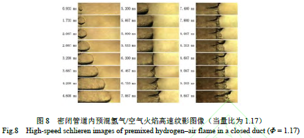 實驗研究方面,華東理工大學(xué)沈曉波團隊針對氫氣、合成氣和氫氣/甲烷等清潔燃料的預(yù)混爆炸、火焰?zhèn)鞑?、反?yīng)動力學(xué)和抑制技術(shù)等進行了系統(tǒng)的研究。他們探究了管道中氫/空氣預(yù)混火焰?zhèn)鞑バ螒B(tài)的變 化,圖8為高速紋影攝像技術(shù)所捕捉到的特殊火焰?zhèn)鞑バ袨?,他們還發(fā)現(xiàn)郁金香變形總是伴隨著火焰尖端速度的脈動。除此之外,沈曉波等人還定義了火焰形變的新階段:如T形火焰和拉伸郁金香火焰等。重慶大學(xué)余明高團隊也對氫氣、合成氣等在封閉管道中的火焰?zhèn)鞑ズ统瑝簞恿W(xué)開展了很多探索工作。