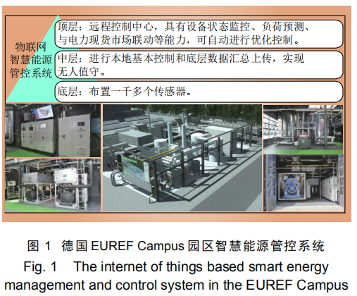 基于物聯(lián)網(wǎng)的智慧能源管控技術(shù)正在全球范圍內(nèi)快速發(fā)展,如德國在 EUREFCampus 園區(qū)能源站項(xiàng)目中構(gòu)建了具有“底層-中層-頂層”3 層架 構(gòu)的物聯(lián)網(wǎng)智慧能源管控系統(tǒng)(見圖 1)。從技術(shù)層面看,智能量測、智能分析是實(shí)現(xiàn)智慧能源管控的核心技術(shù)。智能量測技術(shù)迫切需要在智能傳感器、信息接口、信息通信等方面進(jìn)行技術(shù)攻 關(guān),解決多元數(shù)據(jù)的實(shí)時(shí)精確采集、不同傳感設(shè)備間通信以及信息實(shí)時(shí)高效傳輸?shù)碾y題,提供高效、安全、泛在的信息量測能力。智能分析技術(shù)迫切需要在多能耦合轉(zhuǎn)換關(guān)系分析以及用戶的用能和交易行為分析等方面進(jìn)行攻關(guān),解決海量數(shù)據(jù)實(shí)時(shí)分析挖掘的難題。智慧能源管控技術(shù)是能源流和信息流高度融合發(fā)展的重要體現(xiàn),推動(dòng)綜合能源服務(wù)業(yè)務(wù)以更加綠色高效的方式滿足用戶定制化、多樣化需求,將成為未來綜合能源服務(wù)的核心業(yè)務(wù)之一。