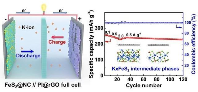 針對上述問題,西安交通大學化學學院高國新副教授、丁書江教授與劍橋大學石墨烯中心郗凱博士合作,采用一種新穎的“吹泡泡”法制備出氮摻雜碳包覆的鐵基硫屬族化合物二維納米復合材料(FeS2@NC),表現(xiàn)出優(yōu)異的鉀離子電池性能和應用前景。在0.1 A/g電流密度下進行鉀離子半電池充放電測試,可逆比容量達到525.5 mAh/g;在10 A/g的高電流密度下的可逆比容量仍有154.7 mAh/g,循環(huán)壽命長達5000圈。與正極匹配后的鉀離子全電池經(jīng)120次循環(huán)后,容量保持率超過88%,庫侖效率超過99.9%。密度泛函數(shù)(DFT)計算表明,硫化鐵(FeS2)比硒化鐵(FeSe2)表面更有利于鉀離子的吸附和擴散,嵌鉀中間相對鉀離子吸附更強;氮摻雜碳包覆層進一步增強了電極材料和鉀離子的相互作用。本工作提出的高性能電極材料設計思想和電化學反應機理研究為開發(fā)可實用化高性能電極提供了借鑒。