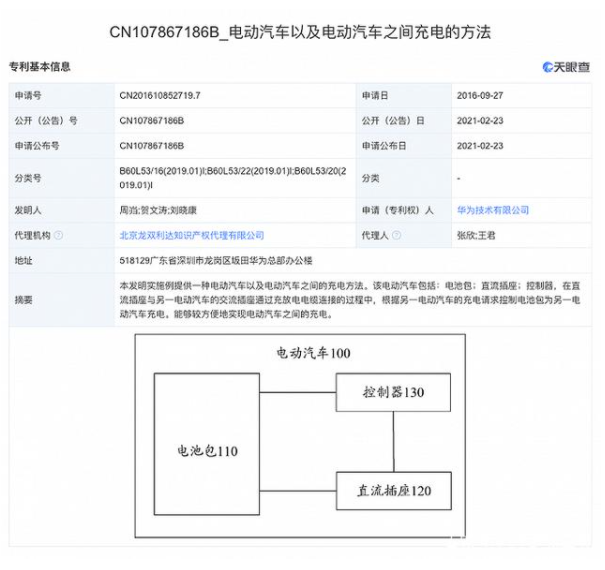 中國儲(chǔ)能網(wǎng)訊:2月24日,華為技術(shù)有限公司對(duì)外公布了一項(xiàng)“電動(dòng)汽車以及電動(dòng)汽車之間充電的方法”專利技術(shù),專利公開號(hào)為CN107867186B,申請(qǐng)日期為2016年9月27日。