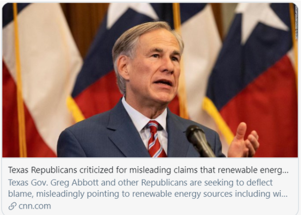 阿伯特在接受??怂剐侣劜稍L時將斷電責(zé)任全都推在新能源身上,他表示,新能源供應(yīng)癱瘓證明“綠色新政”對美國而言是致命的,進一步證明石油是“不可或缺的”。得州農(nóng)業(yè)廳長米勒也在社交媒體上發(fā)文稱,“風(fēng)電發(fā)電裝置不能再多了,這個試驗是一次巨大失敗,讓綠色能源和氣候變化見鬼去吧”。