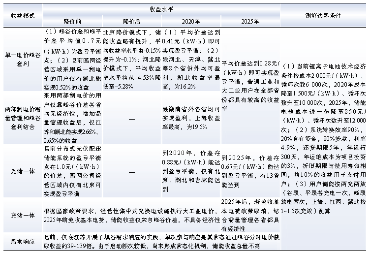 (3)對于客戶側(cè)儲能,需量管理和峰谷價(jià)差共同回收模式下,儲能盈利性水平主要與峰谷價(jià)差、儲能投資建設(shè)成本、循環(huán)次數(shù)、充放電模式、用戶分成比例以及對需量降低的效率影響等指標(biāo)有關(guān)。通過建立儲能成本分析模式進(jìn)行經(jīng)濟(jì)性測算,當(dāng)前,普通工業(yè)和大工業(yè)用戶安裝儲能僅少部分省份能實(shí)現(xiàn)盈虧平衡,隨著儲能技術(shù)經(jīng)濟(jì)性提升,按工業(yè)電價(jià)降價(jià)前目錄電價(jià)計(jì)算,2020年已具有較好的盈利性。按照2019年工業(yè)電價(jià)水平下降要求,在北京市降價(jià)模式下(峰、平、谷價(jià)格統(tǒng)一下降同一額度,峰谷價(jià)差和峰平價(jià)差保持不變),儲能收益略有提升,在多數(shù)省份采用的河北省降價(jià)模式下(下降比例基本相同,峰谷價(jià)差和峰平價(jià)差縮?。瑑δ苁找鎸⒚黠@下降。