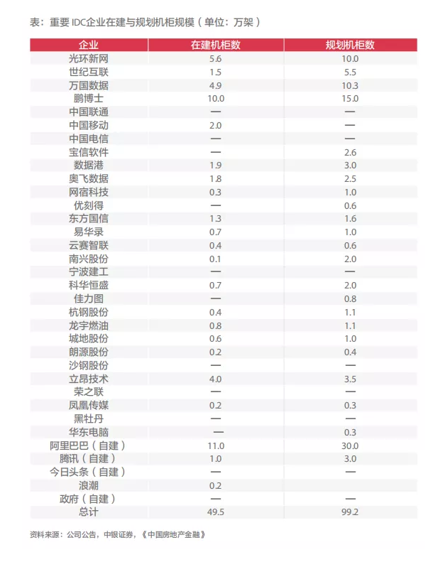 中銀證券分析了34 個主流數(shù)據(jù)中心企業(yè)之后,認(rèn)為目前數(shù)據(jù)中心基本上能夠滿足需求。工信部公布的2018 年數(shù)據(jù)顯示,全國數(shù)據(jù)中心的利用率在60% 以下。但是中銀證券也發(fā)現(xiàn),這34 家企業(yè)公開在建和規(guī)劃建設(shè)的機(jī)柜數(shù)合計在150 萬架,比現(xiàn)有的機(jī)柜數(shù)量增長67%,接近七成的增長反映了行業(yè)對于數(shù)據(jù)中心投入的熱情,這也預(yù)示著下游需求將進(jìn)入爆發(fā)式的增長階段。
