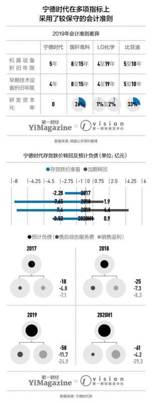 根據(jù)中信證券的核算,通過縮短折舊年限、研發(fā)成本100%費(fèi)用化、提前計(jì)提存貨跌價(jià),以及計(jì)提大量的電池質(zhì)保費(fèi)用、兌現(xiàn)銷售返利等會(huì)計(jì)手段,寧德時(shí)代在2019年將最多可達(dá)42億元的凈利潤“處理”成了運(yùn)營成本。