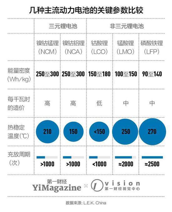 動(dòng)力電池市場(chǎng)目前最常見的兩類解決方案,一是三元鋰電池,二是磷酸鐵鋰電池。兩者間的主要差異在于電芯正極材料所用的合金——磷酸鐵鋰方案安全性好、成本低,但能量密度不高;三元鋰方案能量密度高、耐低溫,但安全性差、成本高。