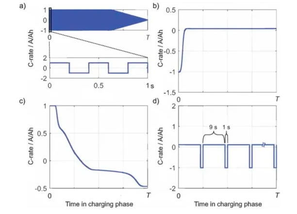 脈沖充電過(guò)程中,電流呈現(xiàn)周期性的變化,以降低濃差極化,避免局部電位變負(fù)或降低因局部鋰離子脫嵌造成的機(jī)械應(yīng)力增加。
