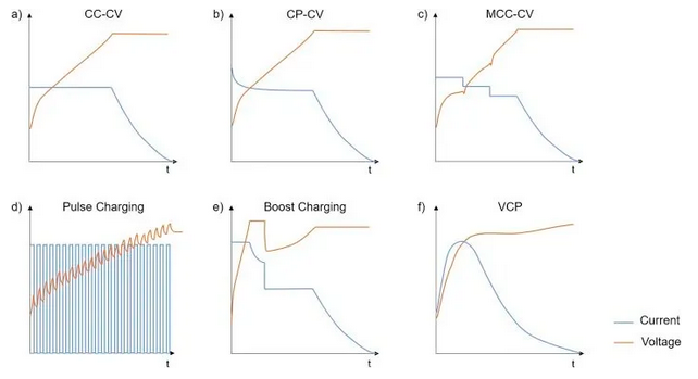 CCCV是目前最常見(jiàn)的充電協(xié)議,即先恒流充電至截止電壓(CC階段),再恒壓充至接近0的小電流(CV階段)。恒壓過(guò)程可以使電極材料內(nèi)的離子濃度分布更均勻,對(duì)于材料發(fā)揮出高比容量至關(guān)重要;但恒壓時(shí)的電流逐漸減小,使CV的充電時(shí)間明顯比CC長(zhǎng)。CC-CV充電模式的簡(jiǎn)單可操作性使其成為最廣泛應(yīng)用的標(biāo)準(zhǔn)充電協(xié)議。但是很多其他重點(diǎn)策略可以減少充電時(shí)間、提高充電效率、提高容量/功率保持率。圖8展示了幾種常見(jiàn)的快充策略曲線(xiàn)。