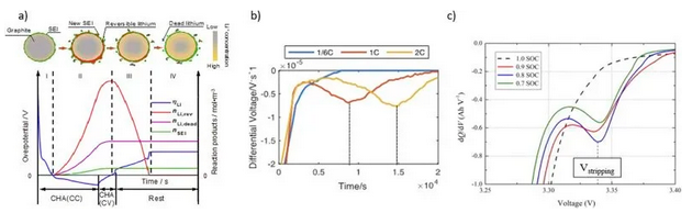 a)CC-CV充電和靜置過(guò)程中的過(guò)電勢(shì)變化模擬。階段I,負(fù)極顆粒上沒(méi)有鋰沉積;階段II,鋰沉積開(kāi)始發(fā)生;階段III,部分可逆的鋰重新嵌入負(fù)極或溶出,剩余的變成死鋰;階段IV,平衡態(tài),死鋰不再參與后續(xù)循環(huán);b) 電壓微分分析(DVA);c)微分容量分析(ICA)