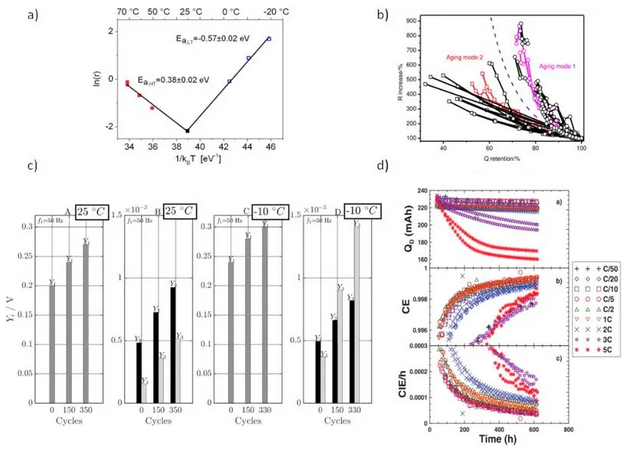 無(wú)損的析鋰觀測(cè)技術(shù)對(duì)于實(shí)際的電池應(yīng)用很重要。一般可用于析鋰表征的檢測(cè)包括SEM,TEM,NMR和XRD等,但這些手段都需要對(duì)電池進(jìn)行破壞或使用特殊電池構(gòu)型。常用的無(wú)損析鋰觀測(cè)利用電池的外部特性,包括老化速率,鋰回嵌的電壓平臺(tái),模型預(yù)測(cè)等方法。如圖6所示,基于老化特征的析鋰檢測(cè)手段包括(a)阿倫尼烏斯方程,(b)衰減過(guò)程的容量和阻抗變化分析,(c)非線(xiàn)性頻域響應(yīng)分析和(d)庫(kù)倫效率分析。