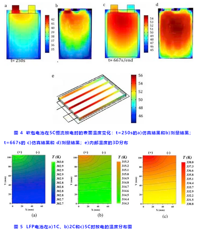 鋰離子電池中,軟包、圓柱、方殼電池的熱量分布與散失是不均勻分布的:例如一些電池材料的面導(dǎo)熱能力較差,因此其熱量相對(duì)于表面會(huì)更多積累在核心位置。此外,電流密度和產(chǎn)熱速率在電池不同位置也不相同。這些不一致性在大尺寸電池上被進(jìn)一步放大。如圖3所示,圓柱電池內(nèi)部中心的溫度要明顯高于表面。對(duì)于軟包或方型電池而言,如圖4和圖5所示,極耳處的溫度要明顯高于其他位置。此外,由于正極鋁集流體比負(fù)極銅集流體的電阻更大,正極極耳溫度常高于負(fù)極極耳。