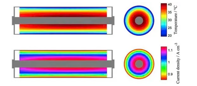 圖3 圓柱電池內(nèi)部溫度和電流密度的分布仿真結(jié)果