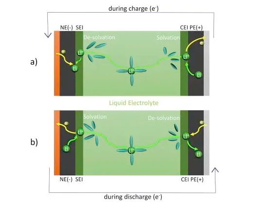 圖 2 鋰離子傳輸示意圖 a)充電,b)放電