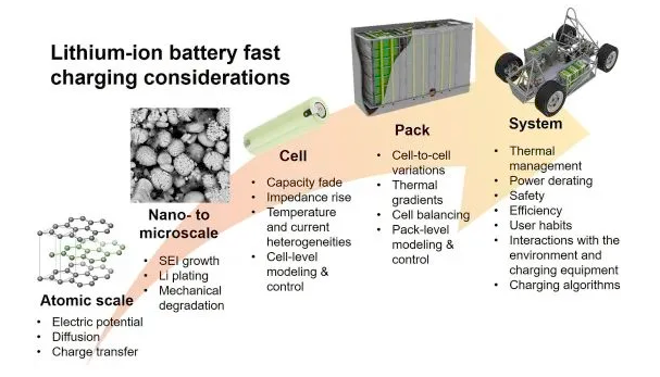 盡管提高電動(dòng)車(chē)充電功率的研究已有較大進(jìn)展,但這些快充技術(shù)并不在所有情況下適應(yīng)。根據(jù)電動(dòng)車(chē)的特定工況和充電環(huán)境,持續(xù)充電過(guò)程中,充電功率會(huì)逐漸衰減。此外,快充模式下,由于安全等因素限制,電池通常只能充至80%的電量;更高電量下,充電倍率會(huì)逐漸減小以避免過(guò)充。此外,充電功率還受到電池管理系統(tǒng)(BMS)的限制。工業(yè)界對(duì)電池快充領(lǐng)域的興趣越來(lái)越濃厚,理解清楚不同充電方法的決速步驟及其對(duì)電池壽命的影響十分必要。本文旨在從快速充電的多尺度和多學(xué)科特性出發(fā),建立微觀過(guò)程、材料特性、電池及Pack設(shè)計(jì)和充電策略?xún)?yōu)化之間的聯(lián)系。
