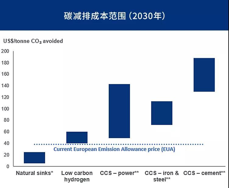數(shù)據(jù)來源:伍德麥肯茲能源轉(zhuǎn)型服務(wù)。*基于自然的解決方案,例如林業(yè)項目;**電力和工業(yè)領(lǐng)域的CCS假定捕獲率為90%。2021年2月1日起的歐洲排放配額價格(EUA)
