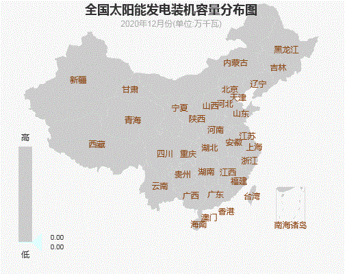 2020年,全國并網(wǎng)太陽能發(fā)電裝機(jī)容量達(dá)25343萬千瓦,同比增長24.1%,占全部裝機(jī)容量的11.52%。全國太陽能發(fā)電裝機(jī)容量分布圖如下所示。