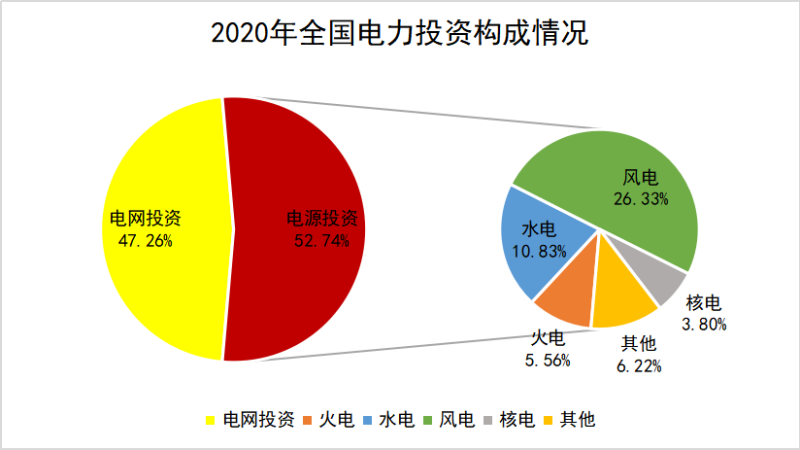 2020年,全國(guó)電力投資累計(jì)9944億元,同比增長(zhǎng)9.6%。電源工程建設(shè)完成投資5244億元,同比增長(zhǎng)29.2%,其中水電、火電、核電和風(fēng)電投資分別完成1077、553、378和2618億元,同比分別增長(zhǎng)19.0%、-27.3%、-22.6%和70.6%;電網(wǎng)工程建設(shè)完成投資4699億元,同比減少6.2%。下圖是2020年全國(guó)電力投資構(gòu)成情況。
