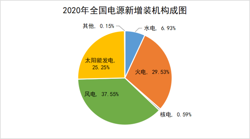 2020年,全國(guó)基建新增發(fā)電設(shè)備容量19087萬(wàn)千瓦。其中,水電1323萬(wàn)千瓦、占全部新增裝機(jī)的6.93%;火電5637萬(wàn)千瓦,占全部新增裝機(jī)的29.53%;核電112萬(wàn)千瓦,占全部新增裝機(jī)的0.59%;太陽(yáng)能發(fā)電4820萬(wàn)千瓦,占全部新增裝機(jī)的25.25%;并網(wǎng)風(fēng)電(7167萬(wàn)千瓦)新增裝機(jī)創(chuàng)歷史新高,占全部新增裝機(jī)的37.55%。各類型電源新增裝機(jī)構(gòu)成如下圖: