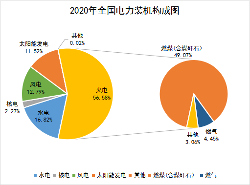 截至2020年底,全國(guó)發(fā)電裝機(jī)容量22億千瓦,同比增長(zhǎng)9.5%,“十三五”期間年均增長(zhǎng)7.6%,高于電力“十三五”規(guī)劃目標(biāo)(發(fā)電裝機(jī)容量20億千瓦,年均增長(zhǎng)5.5%)。分類型看,截至2020年底,全國(guó)水電裝機(jī)37016萬(wàn)千瓦、火電124517萬(wàn)千瓦、核電4989萬(wàn)千瓦、并網(wǎng)風(fēng)電28153萬(wàn)千瓦、并網(wǎng)太陽(yáng)能發(fā)電25343萬(wàn)千瓦。具體構(gòu)成見(jiàn)下圖: