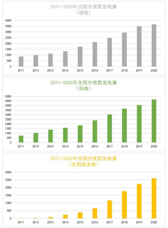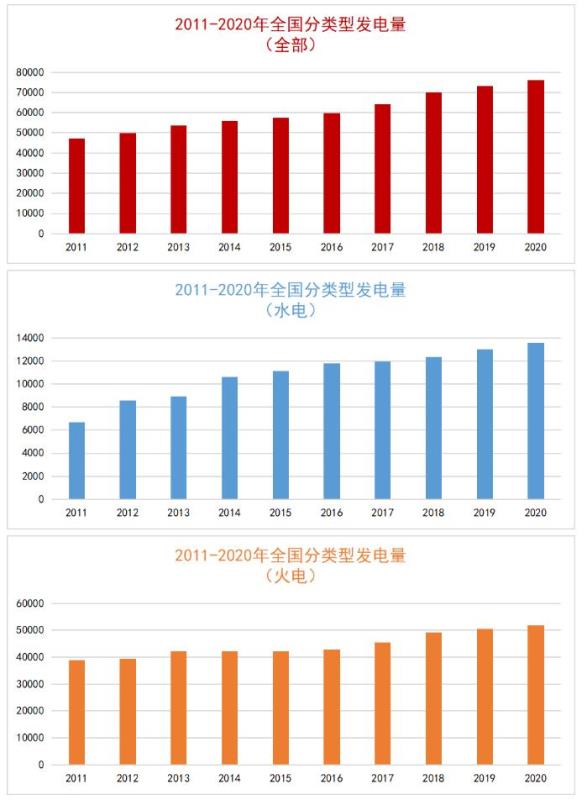 以下是2011-2020年全國(guó)各類型發(fā)電量情況。