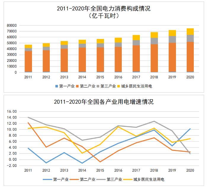 分產(chǎn)業(yè)看,2020年,全國(guó)第一、二、三產(chǎn)業(yè)和城鄉(xiāng)居民生活用電量分別為859、51215、12087和10950億千瓦時(shí),同比分別增長(zhǎng)10.2%、2.5%、1.9%和6.9%。2011-2020年全國(guó)各產(chǎn)業(yè)用電量及其增速情況盤(pán)點(diǎn)如下: