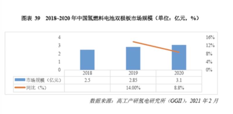 近日,高工產(chǎn)研氫電研究所(GGII)正式發(fā)布的《2021年中國(guó)氫電產(chǎn)業(yè)發(fā)展藍(lán)皮書(shū)(1.0版)》顯示,2020年國(guó)內(nèi)氫燃料電池雙極板市場(chǎng)規(guī)模約為3.1億元,同比增長(zhǎng)8.8%,增長(zhǎng)的主要原因是2020年國(guó)內(nèi)外電堆出貨量的增長(zhǎng)。