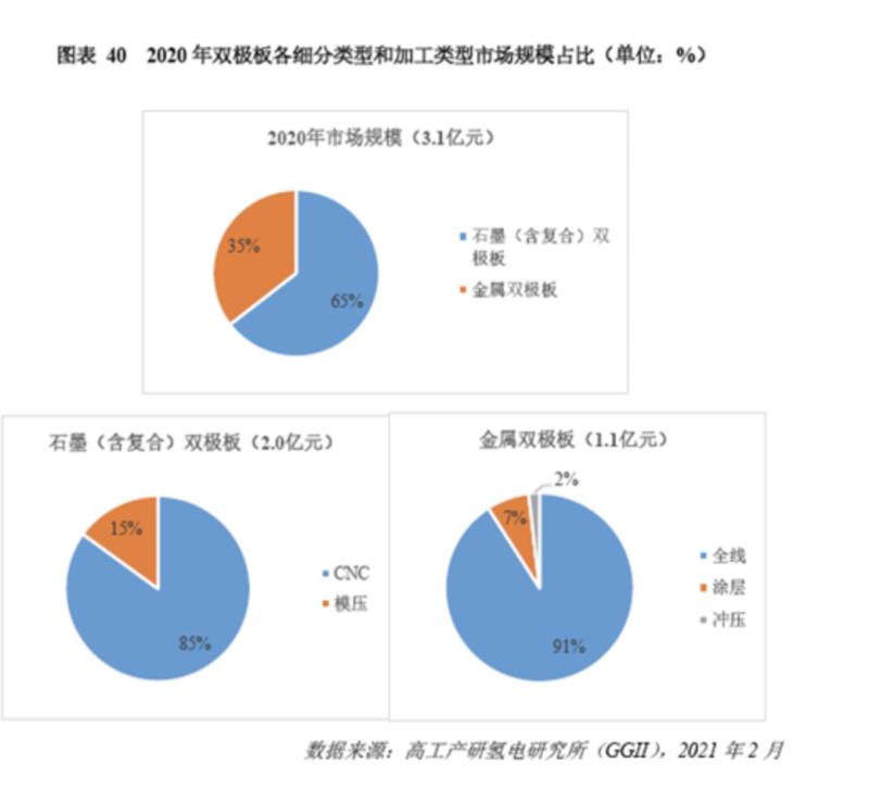 從雙極板的材料構(gòu)成分類(lèi)來(lái)看,當(dāng)前石墨雙極板(含石墨復(fù)合雙極板)依然是市場(chǎng)應(yīng)用的主流,市場(chǎng)規(guī)模占比高達(dá)65%,金屬雙極板用量快速增長(zhǎng),市場(chǎng)占比達(dá)35%。