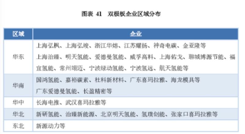 從布局雙極板的企業(yè)來(lái)看,石墨雙極板企業(yè)在我國(guó)的華東、華南、華中、華北和東北都有所分布,其中華東地區(qū)的雙極板企業(yè)數(shù)量最多,也是國(guó)內(nèi)石墨雙極板和金屬雙極板生產(chǎn)最為集中的地區(qū)。國(guó)內(nèi)主要的石墨雙極板企業(yè)上海弘楓、上海弘竣、浙江華熔和金屬雙極板企業(yè)上海治臻都位于華東地區(qū);華南的嘉裕碳素,華中的長(zhǎng)海電推、武漢喜瑪拉雅都涉足布局雙極板。