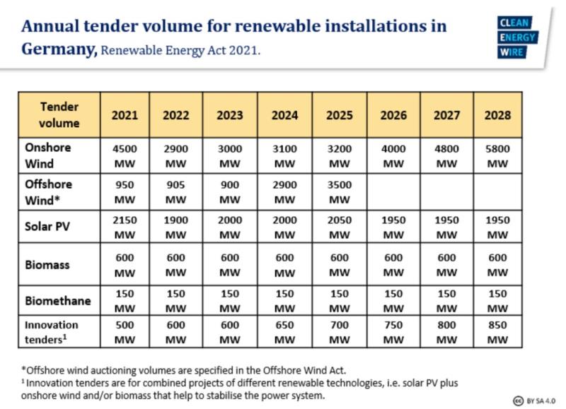 新的EEG計劃將太陽能光伏發(fā)電量提高到100吉瓦(目前約52吉瓦),陸上風(fēng)電增加到71吉瓦(目前55吉瓦),生物質(zhì)增加到8.4吉瓦,海上風(fēng)電增加到2吉瓦。每年還有額外的500-850兆瓦將通過的“創(chuàng)新競標(biāo)”進(jìn)行投標(biāo),不針對具體技術(shù),陸上風(fēng)能、太陽能光伏、生物質(zhì)和/或儲能裝置的組合將共同穩(wěn)定電力系統(tǒng)。