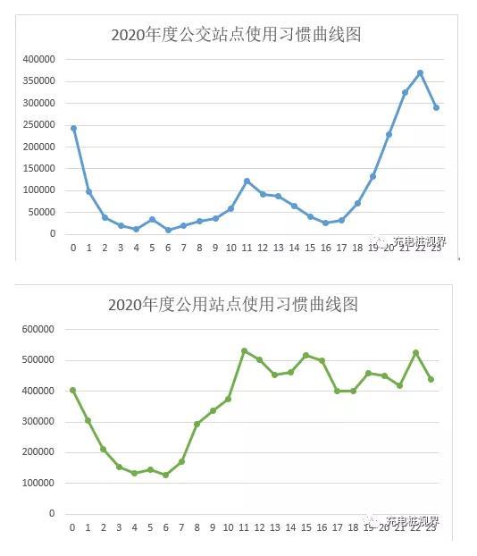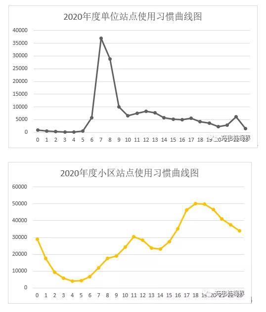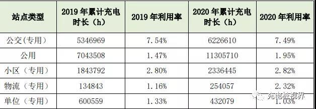 按照利用率的計算公式:各站點利用率=各站點本年度累計充電時長/各站點本年度總時長,其中各站點本年度總時長的計算方式為:本站點類型充電接口數(shù)量x12(月)x 30(天)x 24(小時)。對比下圖,2020年公用站點、小區(qū)站點及單位站點的充電時長及利用率比2019年有略有增長,更多的私家車及營運性車輛選擇居家充電或目的地充電。