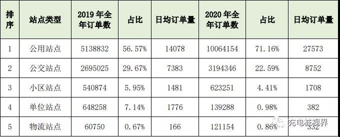 下圖匯總了不同站點類型2020年度的累計充電訂單數(shù)及其與2019年的對比。2019年平均每天產(chǎn)生2.4萬筆訂單,2020年平均每天產(chǎn)生3.8萬筆訂單。