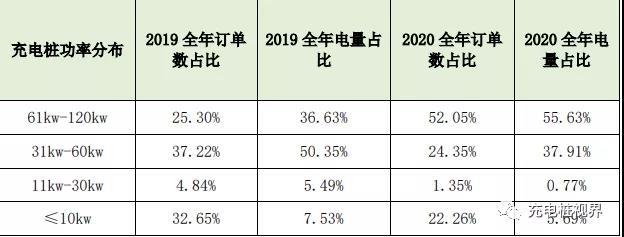 為了更加清晰看到不同設備類型的充電電量,我們又按照設備的功率不同進行了充電電量的統(tǒng)計,全市直流充電樁多以30-60千瓦為主,交流充電樁多為7千瓦的類型。下圖為2020年不同功率設備類型所產(chǎn)生的的訂單量及電量占比。