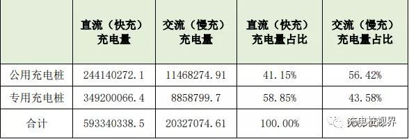 如果按照充電樁設備類型(交直流/慢快充)進行了單獨分類統(tǒng)計(下圖),直流快充貢獻的充電量占比較大。