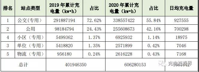 如果按照站點類型劃分,2020年度各站點類型的累計充電量數(shù)值如下圖,從圖可看出2020年全年充電量是2019年的1.5倍(2019年全年4億千瓦時、2018年全年2.1億千瓦時),這說明全市充電需求及充電體量不斷增強增大。
