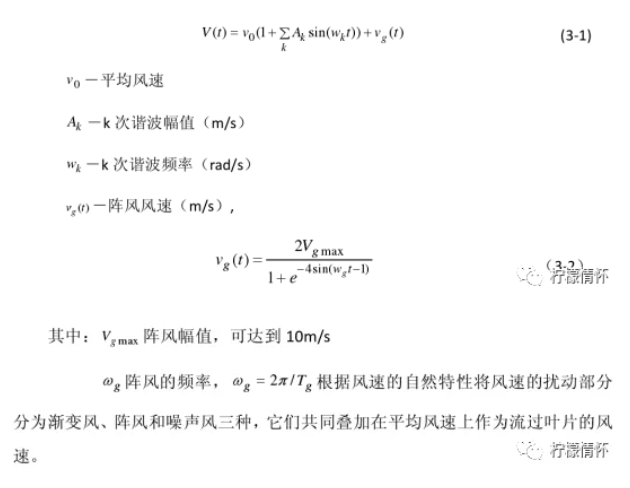 風力發(fā)電的基本模型如圖 3‐2 所示,由于風力發(fā)電主要是由風機驅(qū)動。因此,要了解風力電源對微電網(wǎng)的影響,首先應(yīng)該了解風能的特性。風速模型的建立比較復雜,根據(jù)不同的研究目的應(yīng)該建立不同的風速模型。一般來說,用于風力發(fā)電對電網(wǎng)影響分析的風速模型需要進行一些簡化。將風速分為兩部分,即起決定性作用的平均風速和疊加在平均風速上的各種擾動部分。因此風速模型可以表示成一系列頻率在 0.1-10Hz 的諧波分量總和。