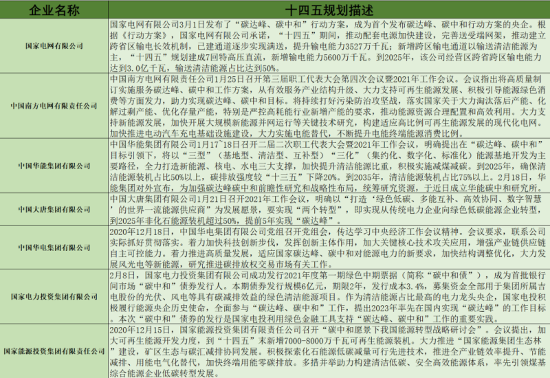 各省市區(qū)“十四五”規(guī)劃出爐,綠色低碳發(fā)展各盡所長,結合自身區(qū)位稟賦和產業(yè)結構特點制定了碳減排相關的政策和目標,國家電網、中國大唐集團、中國華能集團、國家能源集團等能源央企也做出了具體安排。(詳見表2、表3)。