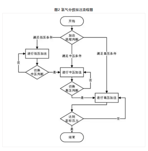 其中,氣源階梯切換的判斷常以氣瓶內平均壓力變化速率為依據,進而可按照低級瓶組到中級瓶組再到高級瓶組的順序從各級儲氫罐中取氣,按照此方式也提高了各級儲氫罐中的氫利用率。氫氣的分級加注流程如圖2所示。