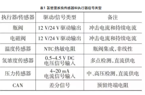 典型氫管理系統(tǒng)的傳感器和執(zhí)行器信號類型和特點如表1所示。