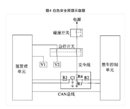 圖中的應急安全硬線裝置由碰撞開關、急停開關、氫系統(tǒng)控制器控制端和整車控制控制端等四個端口同時控制,實際應用中控制端口也可以按照相同的原理增加或減少。