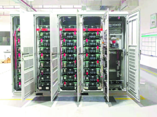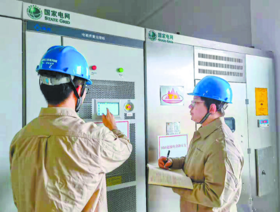 為確保項目可行性,攻關(guān)團隊先在實驗室完成50千瓦樣機各項功能試驗后,再進行500千瓦超級電容微儲能裝置的研制。該裝置主要由超級電容模塊、電力電子變流器和快速功率控制器三部分組成??焖俟β士刂破骺稍?0毫秒內(nèi)完成頻率檢測,電力電子變流器可在2毫秒內(nèi)實現(xiàn)有功功率的快速、精準(zhǔn)支撐,并且電力電子變流器集成了電網(wǎng)諧波主動抑制、無功功率靈活調(diào)節(jié)功能,讓該裝置成為集儲能與電能質(zhì)量管理于一體的新型補償裝置。今年2月7日,這套變電站超級電容微儲能裝置投入使用。