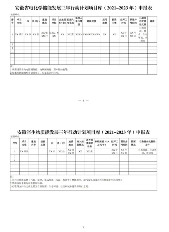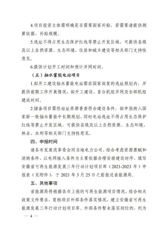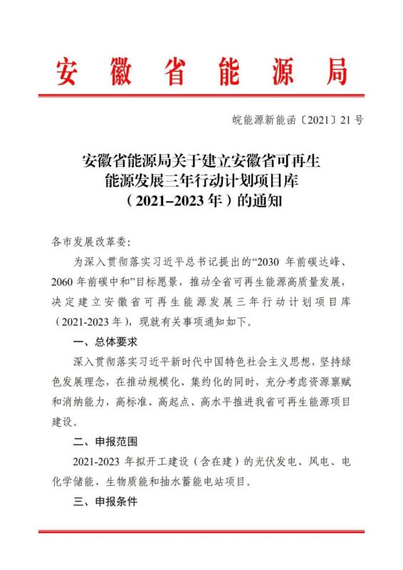 中國儲(chǔ)能網(wǎng)訊:3月9日,安徽省能源局下發(fā)《關(guān)于建立安徽省可再生能源發(fā)展三年行動(dòng)計(jì)劃項(xiàng)目庫(2021-2023 年)的通知》,要求所有2021-2023 年擬開工建設(shè)(含在建)的光伏發(fā)電、風(fēng)電、電化學(xué)儲(chǔ)能、生物質(zhì)能和抽水蓄能電站項(xiàng)目,在2021 年 3 月 25 日之前報(bào)送省能源局,進(jìn)入項(xiàng)目庫。其中關(guān)于電化學(xué)儲(chǔ)能項(xiàng)目建設(shè)文件提出,鼓勵(lì)發(fā)電企業(yè)、電網(wǎng)企業(yè)及第三方社會(huì)資本采取新能源+儲(chǔ)能、獨(dú)立儲(chǔ)能電站、風(fēng)光儲(chǔ)一體化等多種方式,共同參與儲(chǔ)能項(xiàng)目建設(shè)。