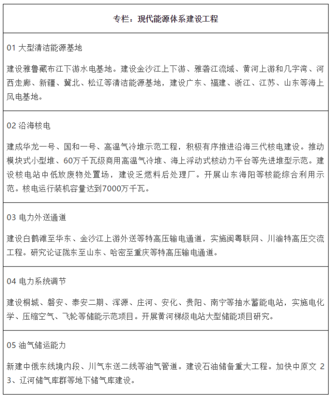 “十四五”規(guī)劃綱要首次設(shè)立能源安全指標,并作為約束性指標納入五年規(guī)劃主要指標。綱要草案提出構(gòu)建現(xiàn)代能源體系,推進能源革命,建設(shè)清潔低碳、安全高效的能源體系,提高能源供給保障能力;實施能源資源安全戰(zhàn)略,堅持立足國內(nèi)、補齊短板、多元保障、強化儲備,完善產(chǎn)供儲銷體系;落實2030年應(yīng)對氣候變化國家自主貢獻目標,制定2030年前碳排放達峰行動方案,錨定努力爭取2060年前實現(xiàn)碳中和;開展智慧能源重點領(lǐng)域試點示范,建設(shè)低碳城市;優(yōu)化能源開發(fā)布局和運輸格局,加強能源資源綜合開發(fā)利用基地建設(shè)等。規(guī)劃綱要原文中能源相關(guān)要點如下:
