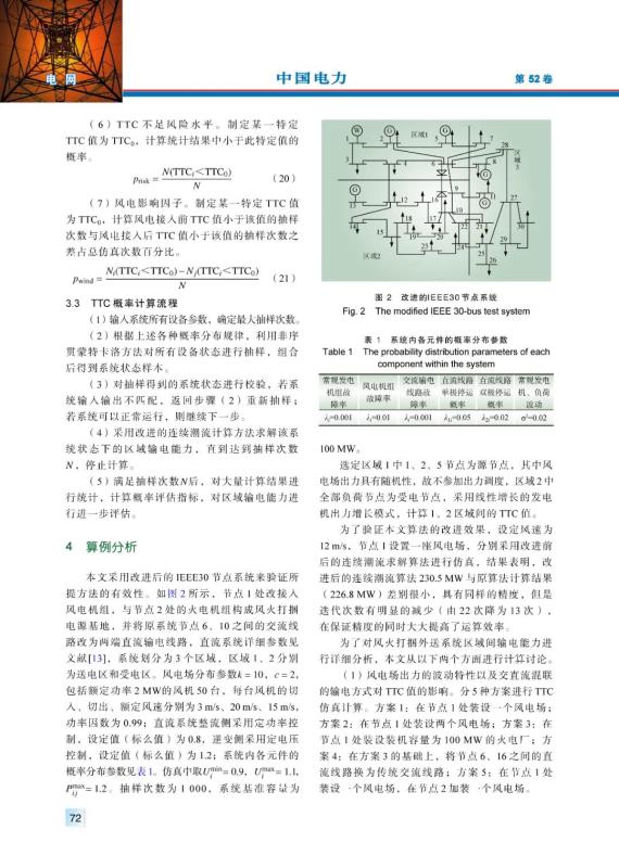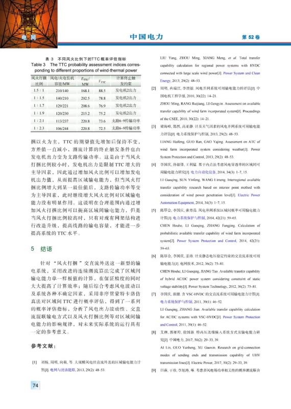 結(jié)論:針對(duì) “風(fēng)火打捆 ”交直流外送這一新型的輸電系統(tǒng),采用改進(jìn)的連續(xù)潮流算法完成了區(qū)域間輸電能力單一樣板值的計(jì)算,在保證精度的同時(shí)大大提高了計(jì)算效率;隨后綜合考慮風(fēng)電波動(dòng)以及系統(tǒng)各種不確定因素,采用非序貫蒙特卡洛仿真法對(duì)區(qū)域間TTC進(jìn)行概率評(píng)估,得到了一系列的概率評(píng)估指標(biāo),分析了風(fēng)電出力波動(dòng)性、交直流混聯(lián)輸電方式以及風(fēng)火打捆比例等對(duì)區(qū)域間輸電能力的影響規(guī)律,對(duì)未來實(shí)際系統(tǒng)的運(yùn)行具有一定的參考意義。