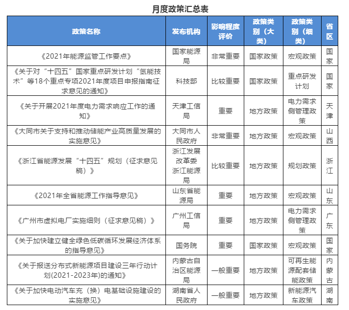 同月,《浙江省能源發(fā)展“十四五”規(guī)劃(征求意見稿)》超前公布,規(guī)劃明確了先進(jìn)儲(chǔ)能技術(shù)與應(yīng)用要實(shí)現(xiàn)跨越式發(fā)展,提出了當(dāng)前儲(chǔ)能發(fā)展面臨的核心問(wèn)題,有意推動(dòng)儲(chǔ)能技術(shù)研發(fā)和應(yīng)用,并開展各類一體化工程建設(shè)。而在電力市場(chǎng)化進(jìn)程中,電力需求側(cè)管理和可再生能源市場(chǎng)參與機(jī)制、輔助服務(wù)市場(chǎng)化機(jī)制等將是推動(dòng)區(qū)域儲(chǔ)能商業(yè)化應(yīng)用的關(guān)鍵。山西省大同市印發(fā)《大同市關(guān)于支持和推動(dòng)儲(chǔ)能產(chǎn)業(yè)高質(zhì)量發(fā)展的實(shí)施意見》,再次提出了增量新能源項(xiàng)目?jī)?chǔ)能配置比例要求(配置比例不低于5%),并充分考慮了儲(chǔ)能產(chǎn)品市場(chǎng)應(yīng)用的準(zhǔn)入標(biāo)準(zhǔn),財(cái)政補(bǔ)貼和市場(chǎng)機(jī)制將是激發(fā)用戶側(cè)和“新能源+儲(chǔ)能”應(yīng)用活力的重要抓手。與此同時(shí),山西省有關(guān)領(lǐng)導(dǎo)已督辦相關(guān)部門落實(shí)儲(chǔ)能發(fā)展市場(chǎng)化機(jī)制,全省儲(chǔ)能發(fā)展支持政策有望出臺(tái)。規(guī)劃和宏觀指導(dǎo)意見兩類政策將成為2021年各地區(qū)儲(chǔ)能政策發(fā)布的主要形態(tài),一方面各地“十四五”規(guī)劃將劍指儲(chǔ)能產(chǎn)業(yè)發(fā)展和技術(shù)應(yīng)用,另一方面各地將細(xì)化政策措施,全面指導(dǎo)儲(chǔ)能產(chǎn)業(yè)化發(fā)展和商業(yè)化應(yīng)用。儲(chǔ)能政策的常態(tài)化落地預(yù)示著“元年”的到來(lái)。