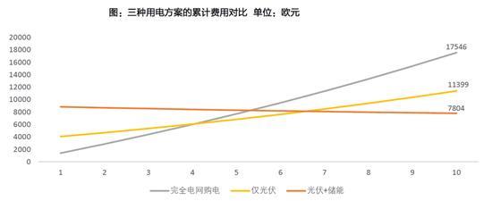 德國是高電費(fèi)國家,也是光伏與儲能系統(tǒng)走在最前列的國家,且他的政策要求了電池系統(tǒng)必須具有10年質(zhì)保期。因而我們以德國為例,根據(jù)Solarpower EU的數(shù)據(jù),德國家庭在30%補(bǔ)貼的情況下,十年的費(fèi)用測算對比如下。