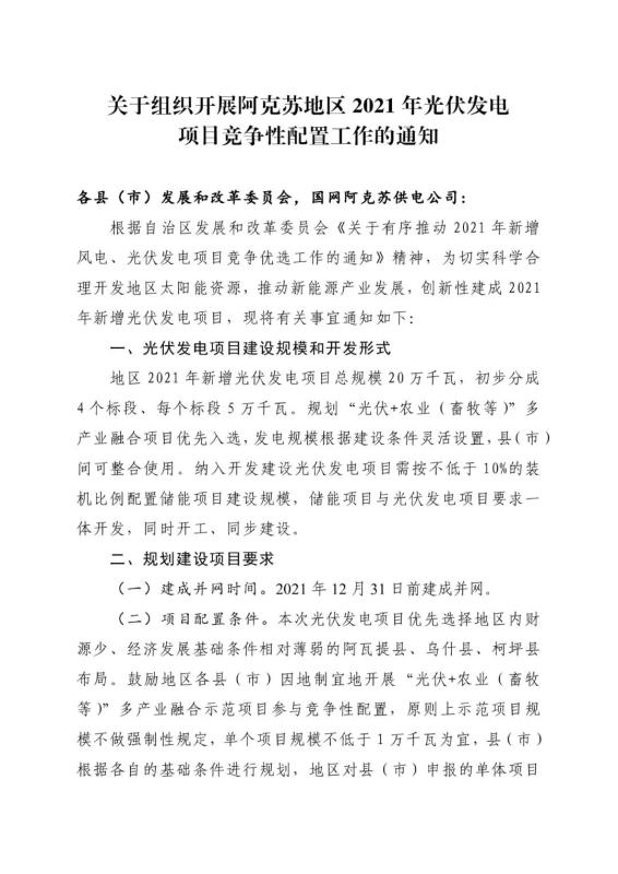 中國儲能網訊:近日,阿瓦提縣發(fā)改委轉發(fā)了《關于組織開展阿克蘇地區(qū)2021年光伏發(fā)電項目競爭性配置工作的通知》。