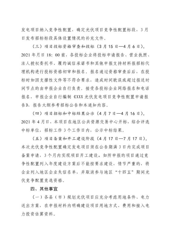 根據文件,3月12日—19 日為項目規(guī)劃、公告階段,各縣(市)根據地區(qū)2021 年光伏發(fā)電項目建設要求編制申報材料,3月19日前以正式公文上報。3月20日—3月23日為項目優(yōu)選階段,地區(qū)根據各縣(市)的申報材料,組織相關單位、專家審查符合條件的光伏發(fā)電項目納入競爭性配置,確定光伏項目競爭性配置標段。