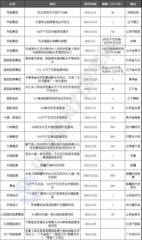 2021年開(kāi)年至今,短短不足3個(gè)月,國(guó)家電投、大唐、國(guó)家能源集團(tuán)、華能等央企持續(xù)加大對(duì)新能源項(xiàng)目的投資力度。其中,風(fēng)光水火互補(bǔ)、風(fēng)光火儲(chǔ)一體化項(xiàng)目等綜合能源基地項(xiàng)目的簽約成為“十四五”開(kāi)年的重頭戲。