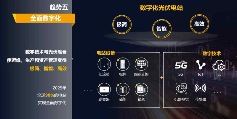 數(shù)字化是智能化基礎(chǔ)。隨著5G、云等數(shù)字化技術(shù)快速演進(jìn),預(yù)計(jì)2025年將有90%以上的電站實(shí)現(xiàn)全面數(shù)字化,讓光伏電站極簡、智能、高效的管理成為可能,從一個(gè)啞電站變成一個(gè)有機(jī)的智能生命體。